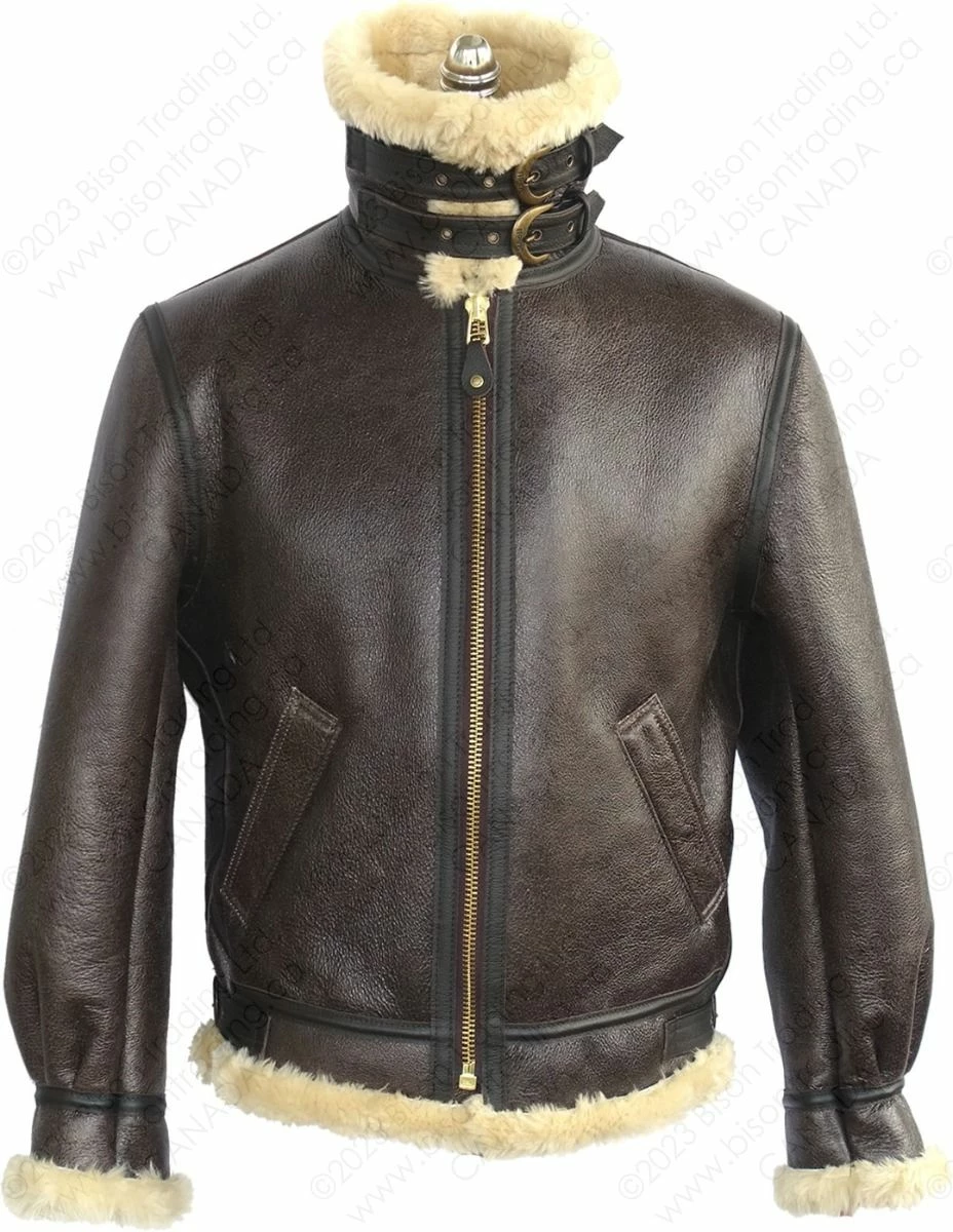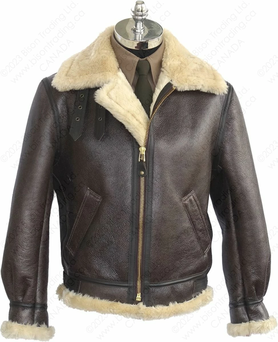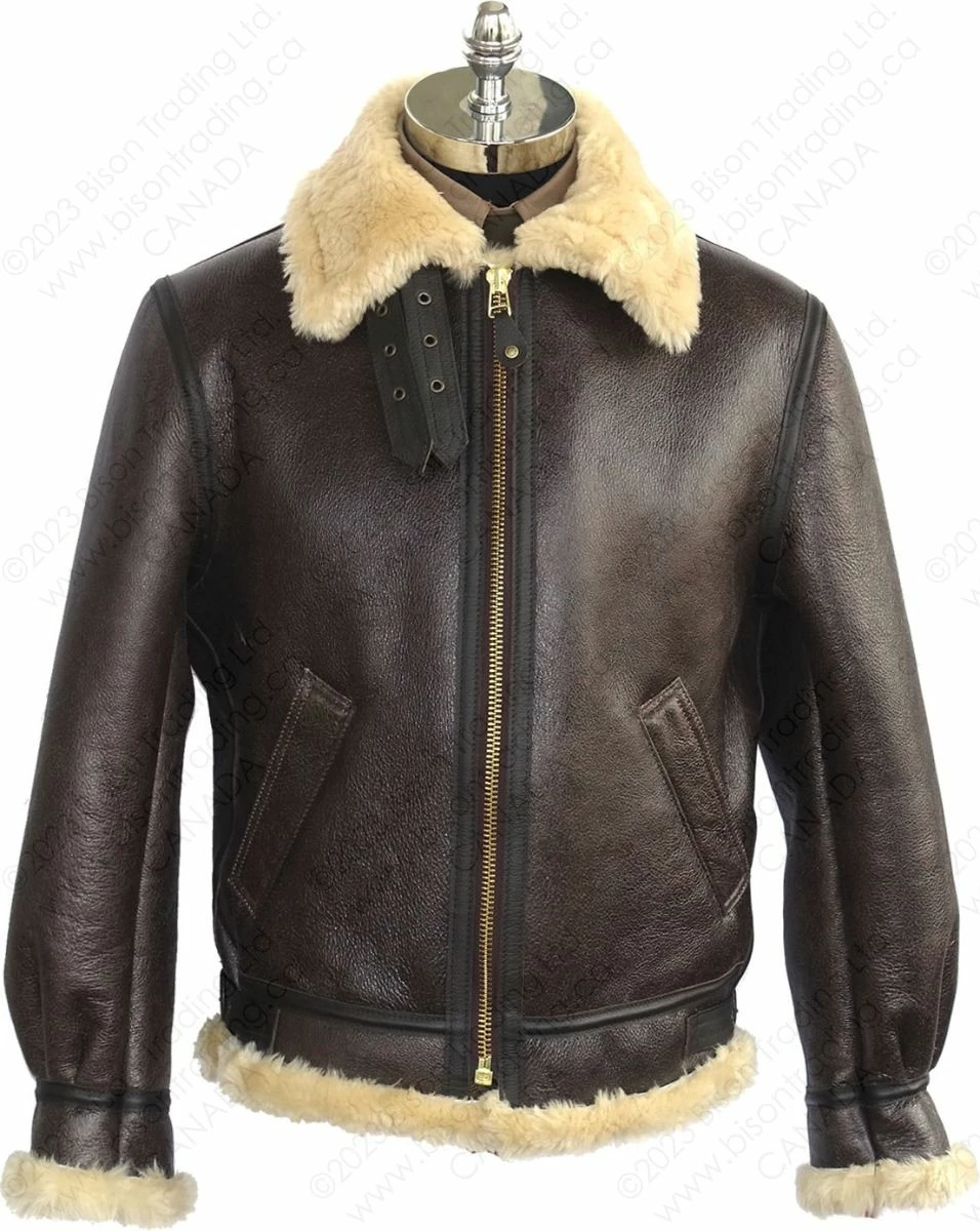 This B-3 is the classic WWII sheepskin leather “Bomber” jacket.