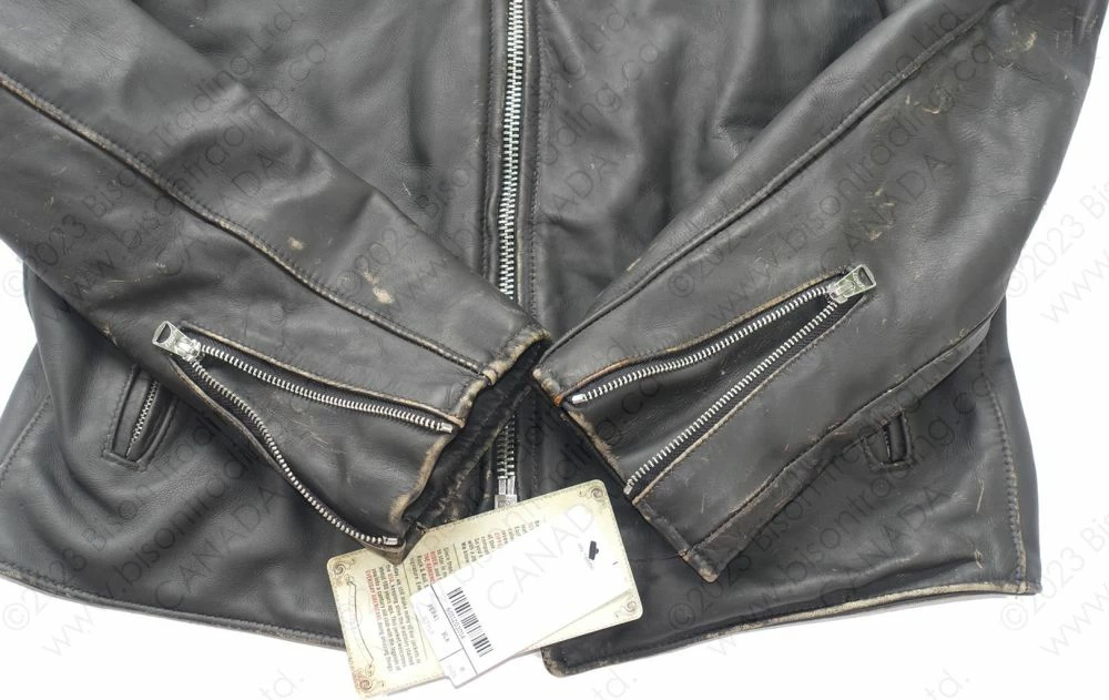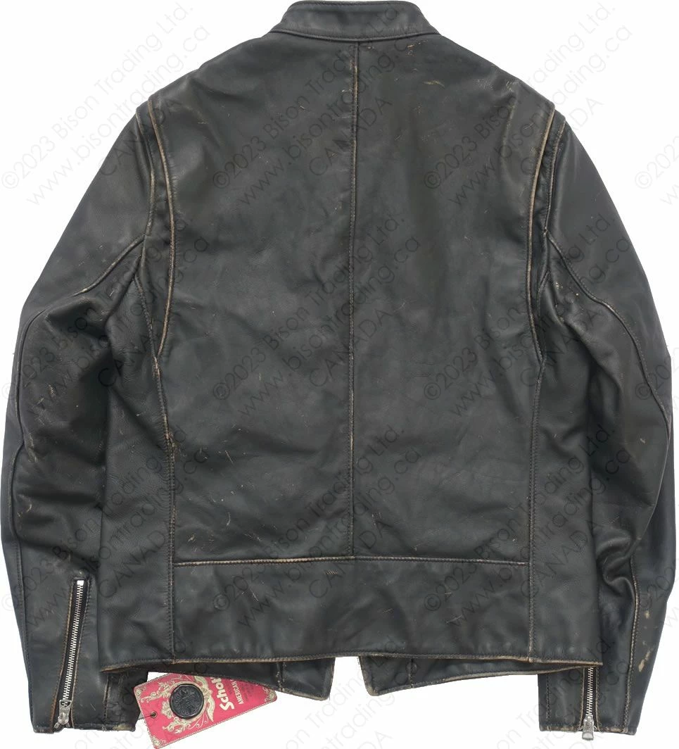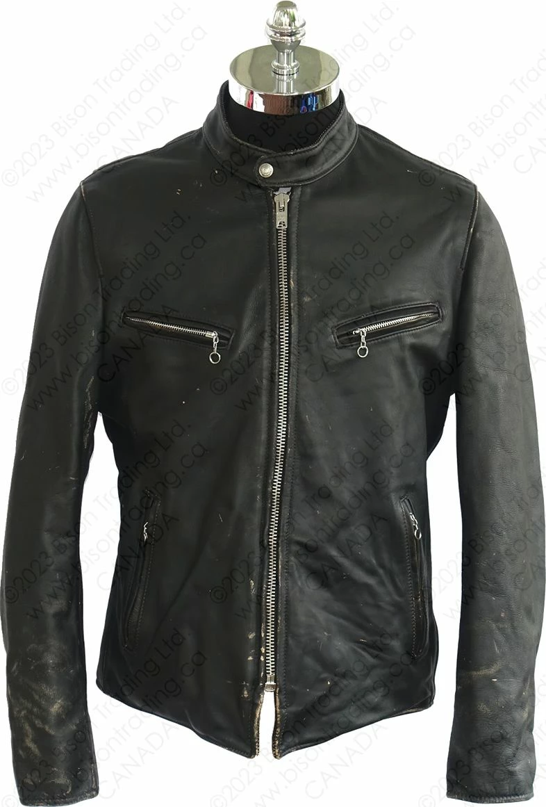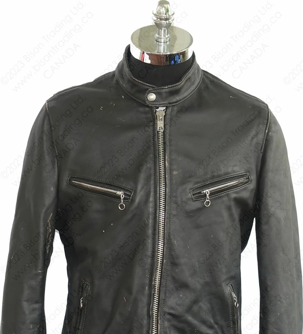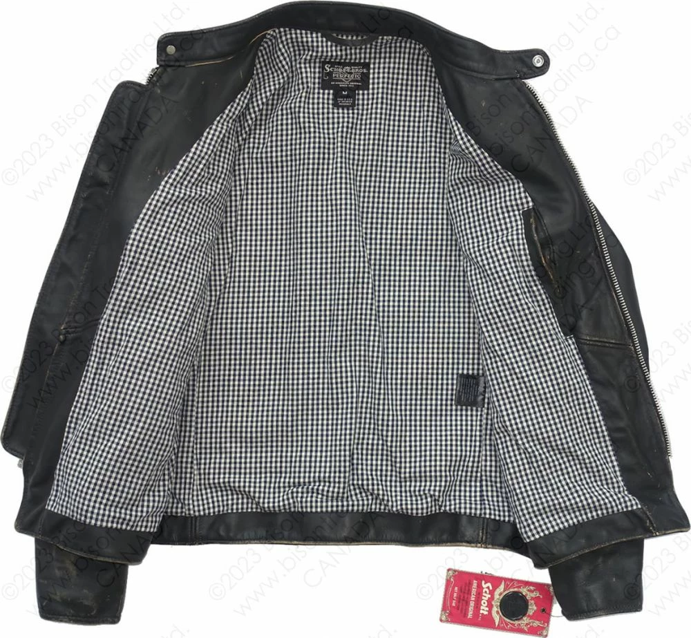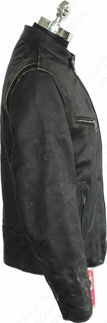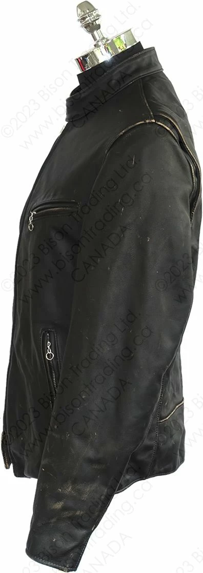 25″ heavyweight hand vintaged cowhide retro café racer jacket. Features 4 zippered front pockets and bi-swing back. Anitque nickel hardware and 100% cotton gingham lining.