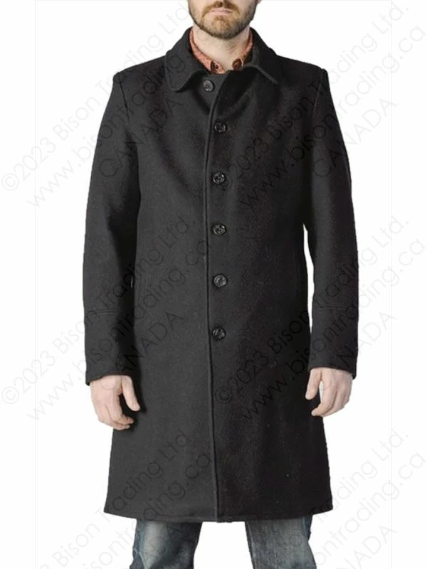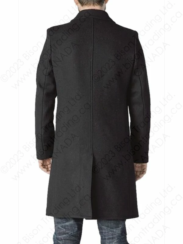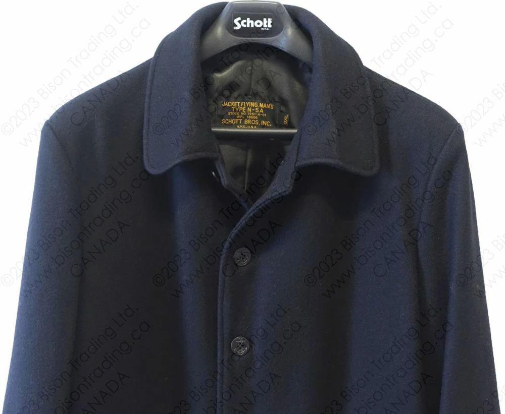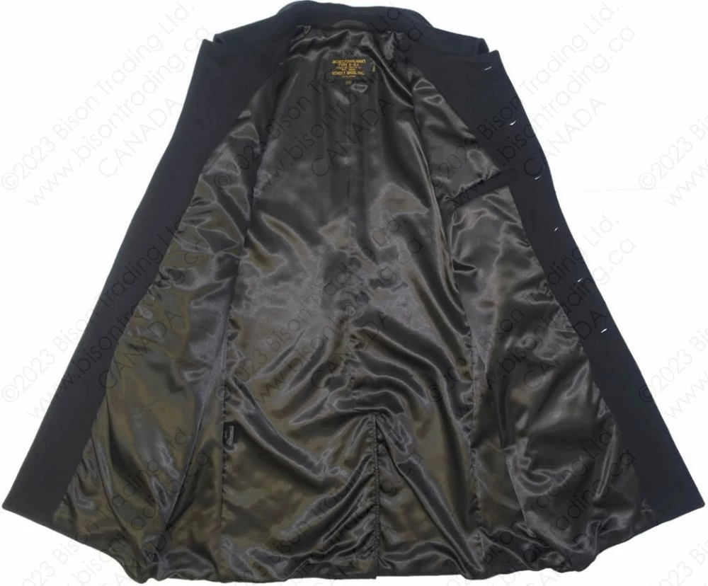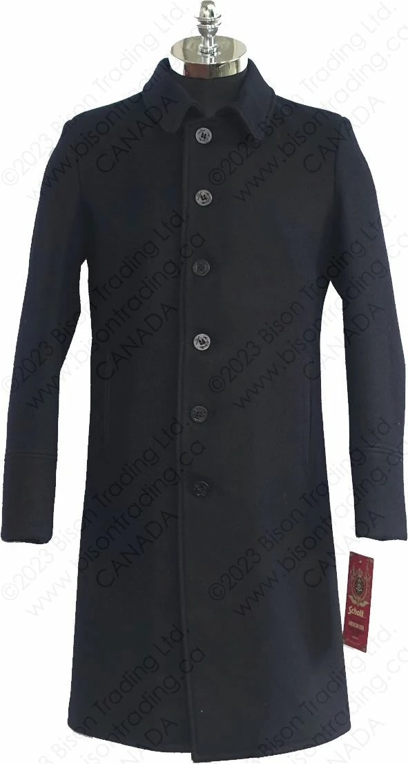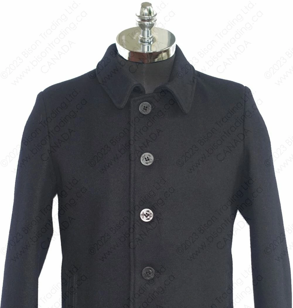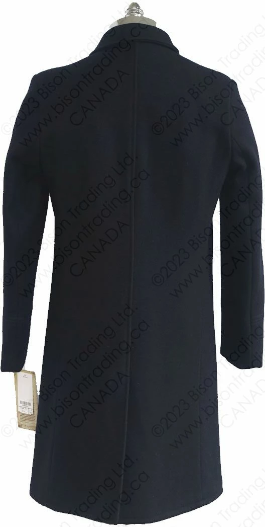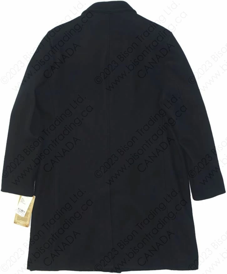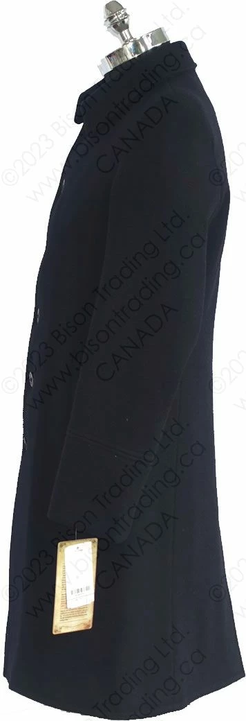 40” Single breasted officer’s trenchcoat with no epaulets made from 24 oz. wool/nylon has front welt pockets and polyester lining. Made in USA.